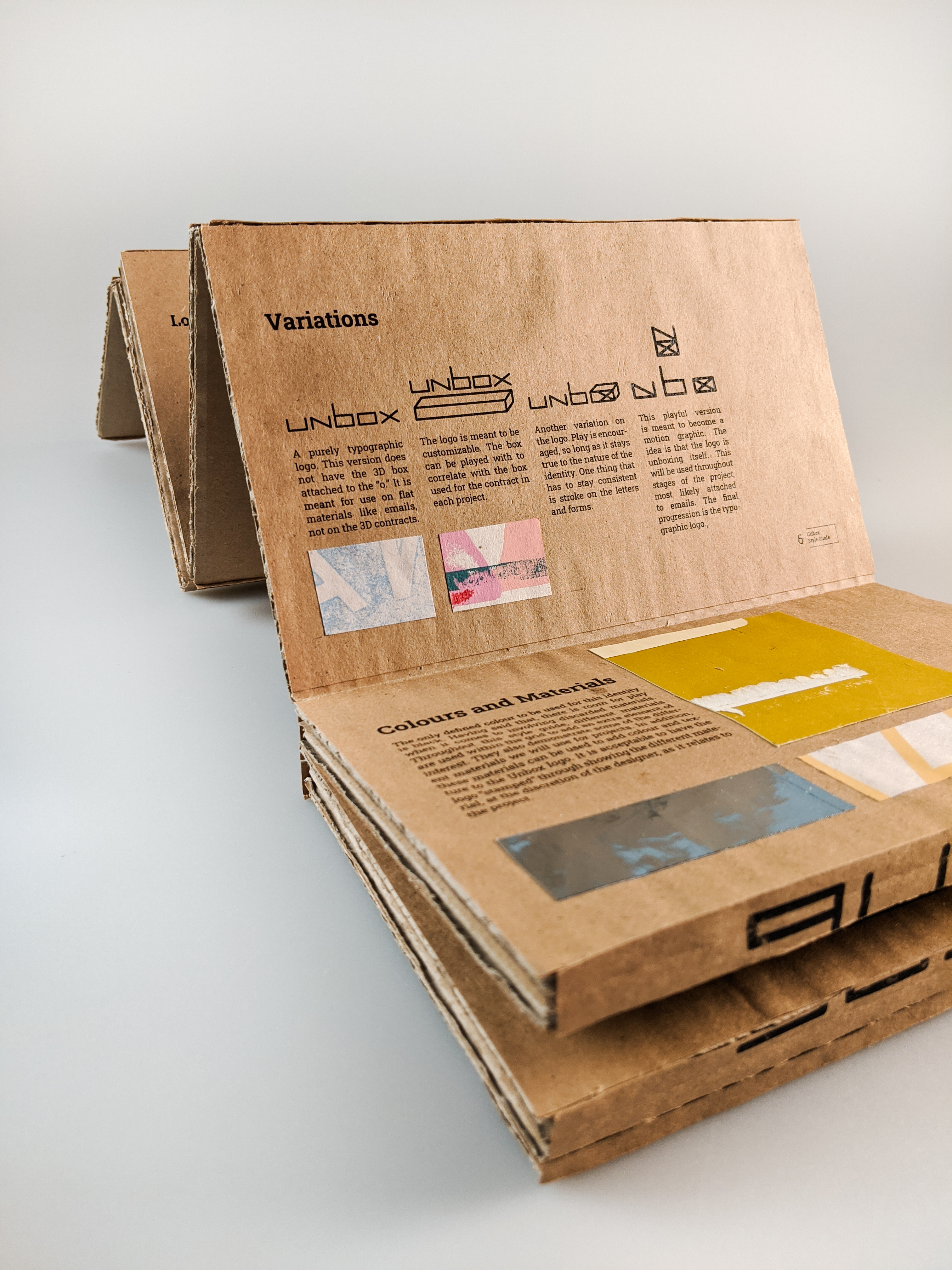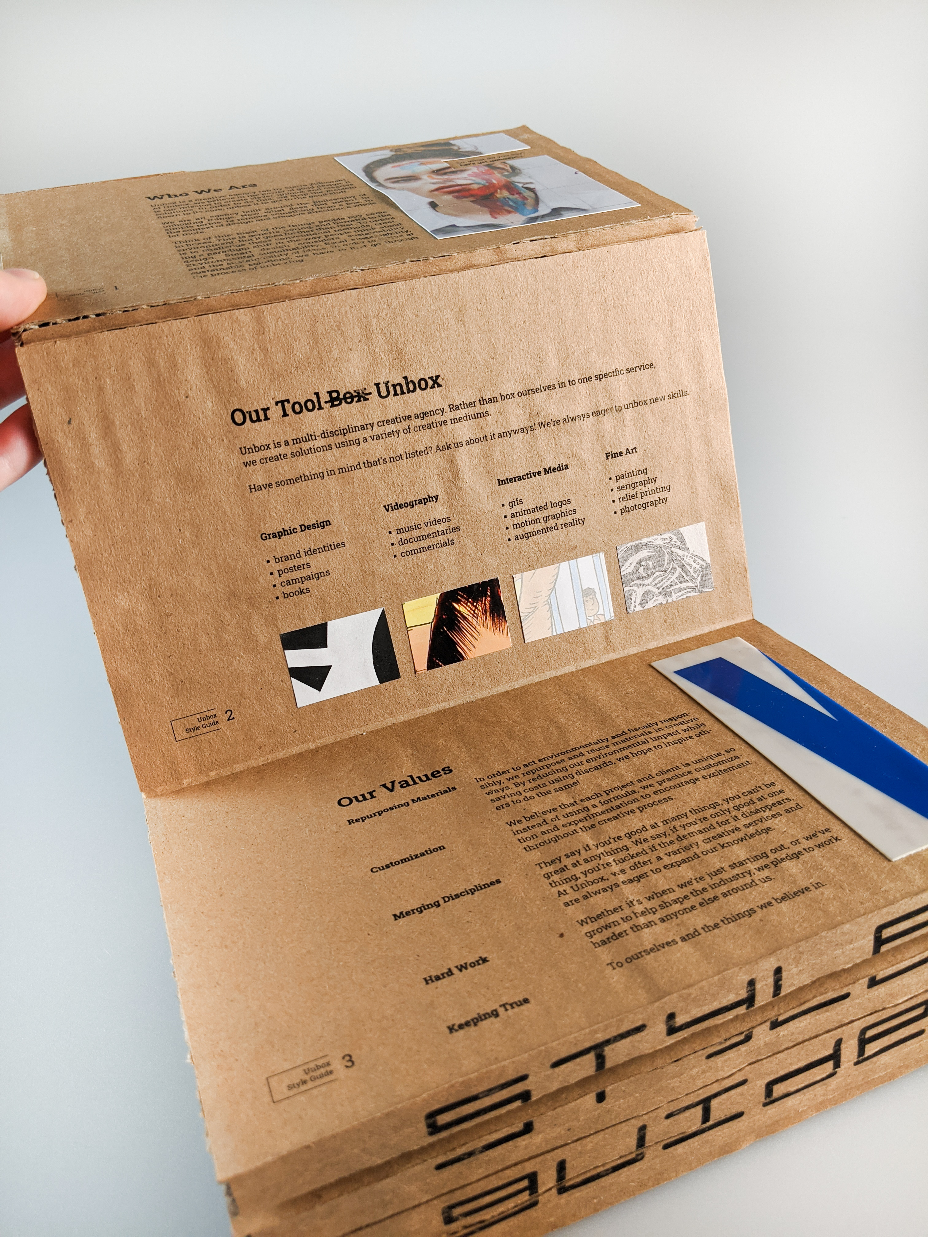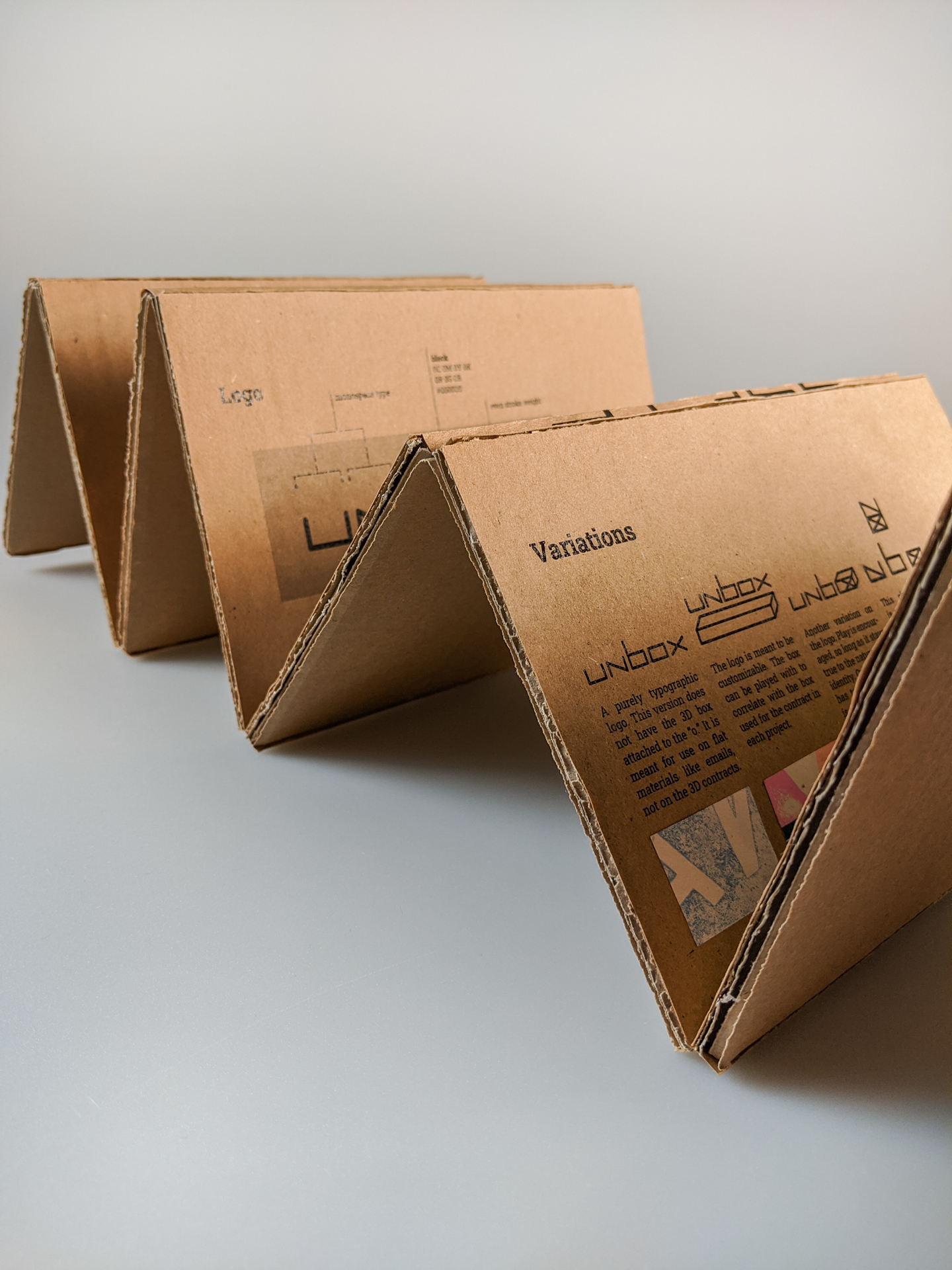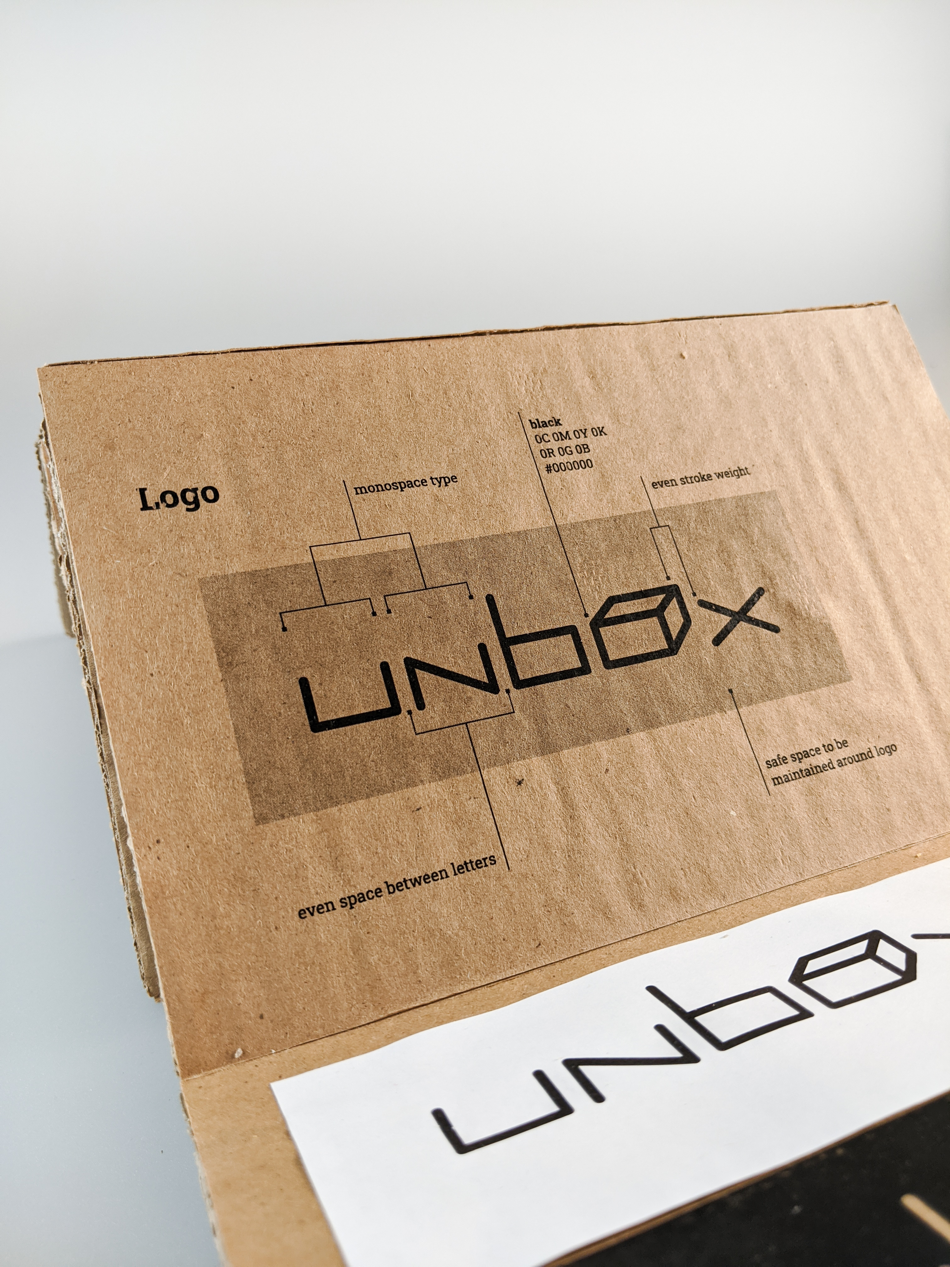 After struggling to brand an identity under my name, or some variation of it, I started to think of other words or phrases that could represent me and my design philosophies. The phrase “out of the box” came to mind. I shortened it to “Unbox” and created a design and philosophy based on what it could mean to a creative agency.